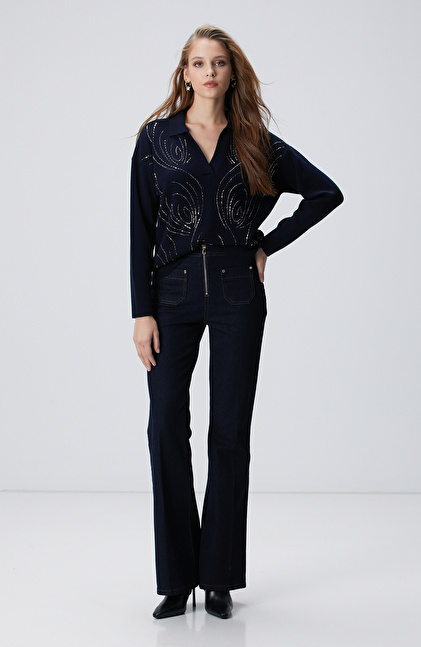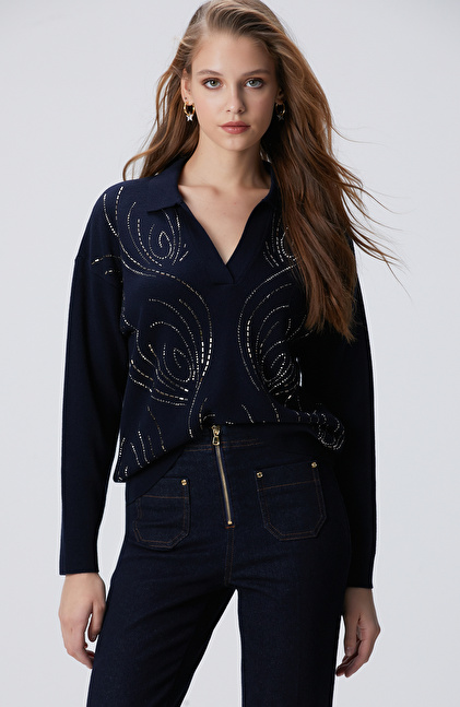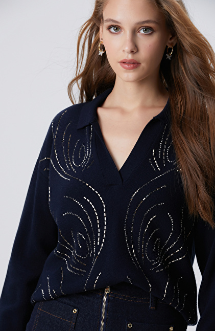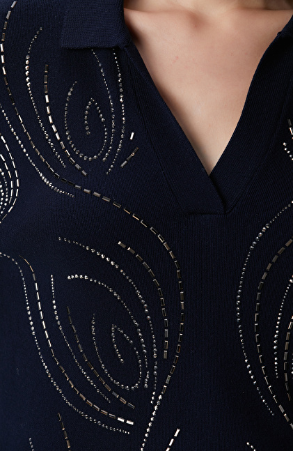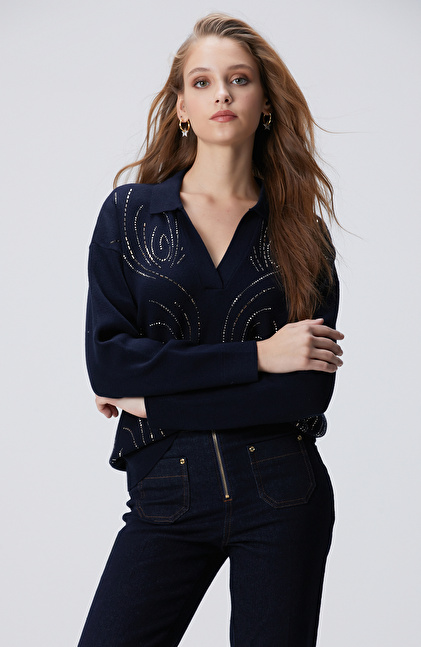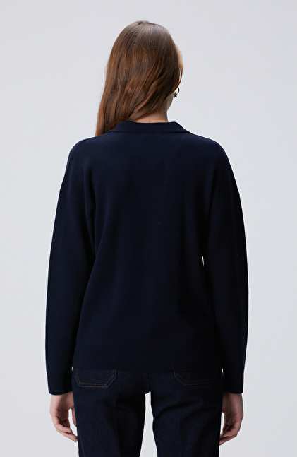 Koyu Lacivert Polo Yaka İşlemeli Kazak