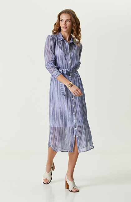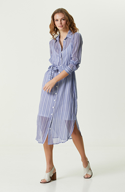 Lüks ve konforu bir arada sunan Lacivert Beyaz Desenli Uzun Gömlek Elbise, NetWork Smart Casual koleksiyonunun öne çıkan parçaları arasındadır. Beyaz ve lacivert tonlarının yer aldığı desenli elbise hem klasik hem de modern görünüm sağlar. Her zaman şık görünmeye özen gösteren kadınların yaz kombinlerine lüks bir detay ekler ve kemeri, gömlek yakası, hoş dokusu ile gün boyu konforlu hissettirir. Tasarımda yer alan zarif yırtmaç, boydan düğme detayı gündelik ve ofis kombinlerinize yenilikçi bir stil kazandırır. Günün her saatine uygun şık elbiseyi, beyaz loafer ile giyebilir, turkuaz el çantası ve kırmızı gibi kontrast renkli takılarla yenilikçi bir stil elde edebilirsiniz.