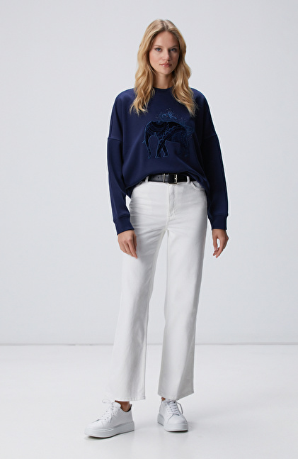 Lacivert Fil Nakışlı Sweatshirt