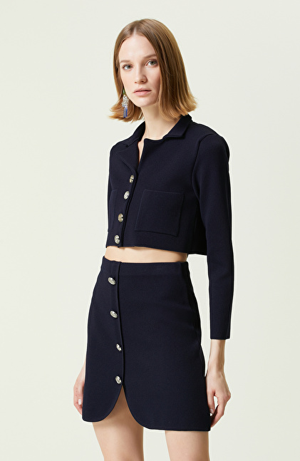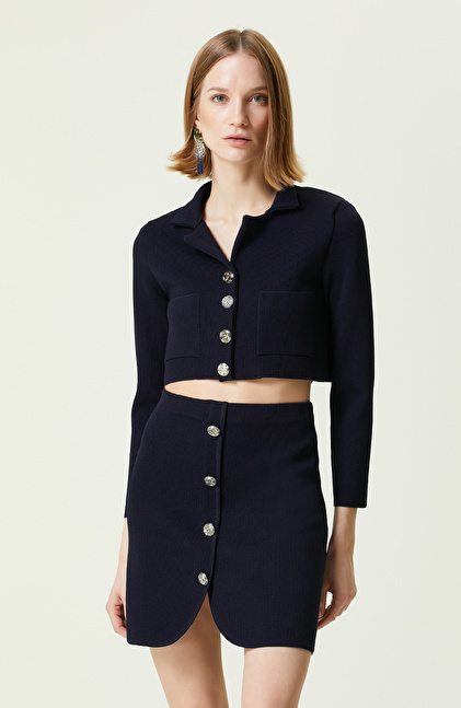 Gömlek Yaka;Uzun Kol;Basic Fit;Triko;Pike Dokulu;Düğmeli;Crop