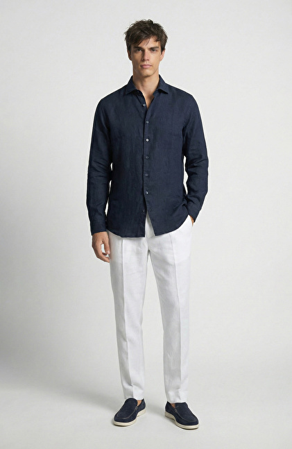 Slim Fit; Alttan Britli Yaka; Uzun Kol; Keten Gömlek;Bu görsel, yapay zeka teknolojisi kullanılarak üretilmiştir.