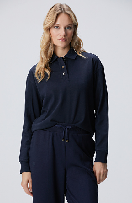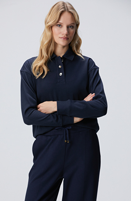Basic Fit; Polo Yaka; Cepsiz; Metal Düğmeli; Uzun Kol Sweatshirt