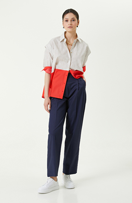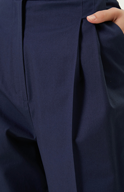 NetWork'ün klasik ve modern stilleri harmanlayarak tasarladığı zamansız Lacivert Pilili Düz Paça Yüksek Bel Pantolon, öz güveni yüksek ve stil sahibi kadınlara hitap eder. Kış koleksiyonunun Business serisinde bulunan tasarım, yüksek beli ve bol paçası sayesinde retrodan moderne kadar tüm stillere uyarlanabilir. Pili detayı bol paça tasarımına eşlik ederek rahat bir görünüm oluşturur, ayrıca konforlu hissetmenizi sağlayan regular fit kalıba sahiptir. Dokuma kumaşı, yumuşak ve yüksek kaliteli malzemelerden yapıldığından ideal kış görünümleri tasarlamanıza olanak tanır. Lacivert pantolonu; mavi beyaz çizgili gömlek, beyaz triko hırka, bej rengi rugan stiletto ve bej el çantası modelleri ile kombinleyebilir, mercan renkli takılarla hareketli görünümler oluşturabilirsiniz.