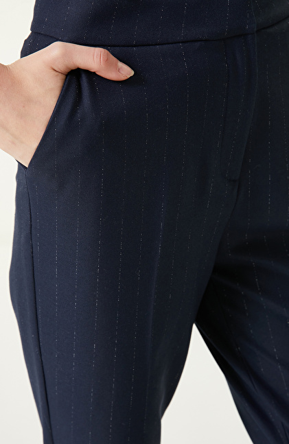 Klasik stile sahip NetWork kadınlarının vazgeçilmezi olan Lacivert Simli Çizgili Pantolon, lüks tasarımı ile öne çıkar. İş hayatında, özel ve önemli günlerde kullanabileceğiniz bu pantolon, basic tasarımı ile farklı kombinlerinize uyum sağlayabilir. Gün boyu rahat etmenizi sağlayacak kumaşı, sonbahar kış sezonu için uygundur. Lüks ve zamansız moda anlayışına uygun pantolon, kombinlerinize elegan bir hava katar. Sim çizgili detayları ile klasik tarzınıza feminen bir dokunuş yapar ve modern bir görünüm elde etmenizi sağlar. Lacivert renkli pantolon ile klasik ve casual stili bir arada oluşturmak için beyaz tişört, blazer ceket ve beyaz sneaker kombini yapabilirsiniz.