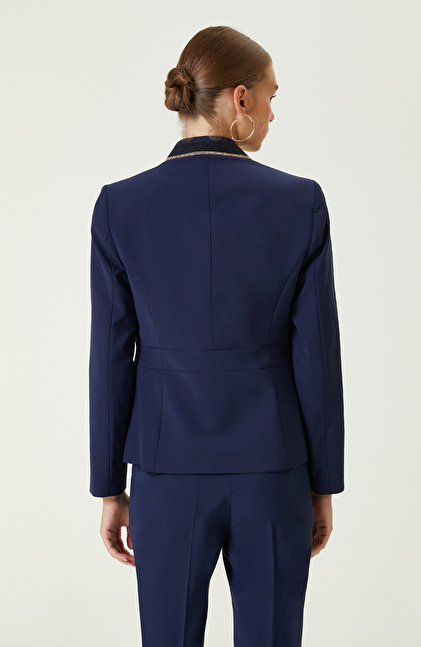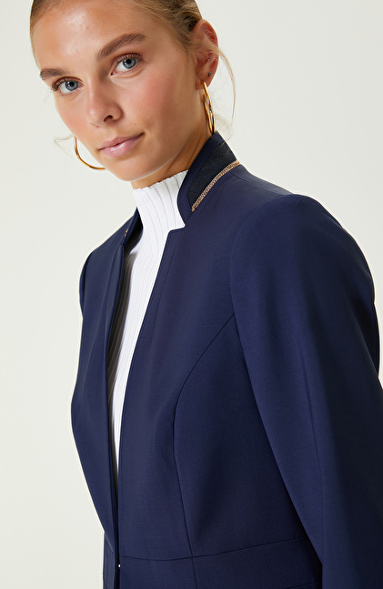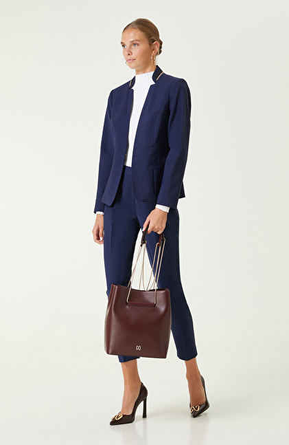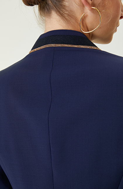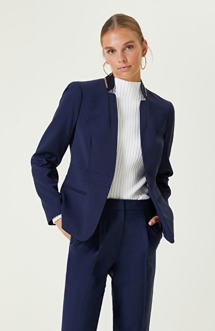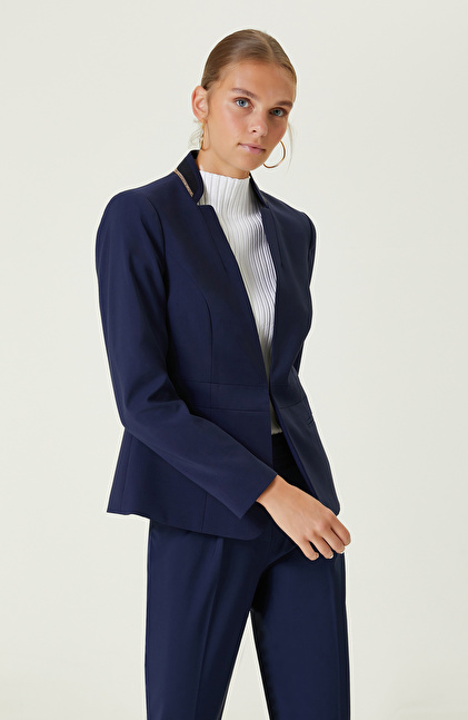 NetWork’ün kadın sonbahar/kış dönemi için tasarladığı Lacivert Yakası Aksesuarlı Ceket, markanın lüks ve yenilikçi moda anlayışının bir simgesidir. Yün karışımlı kaliteli kumaşlar kullanılarak hazırlanan model, V yaka ve uzun kol detaylarına sahiptir. Regular fit kalıplı tasarım, bedenin rahatını düşünür ve yapısı sayesinde soğuk günlerde sıcaklık hissi uyandırır. NetWork Business koleksiyonunun bir parçası olan ceket, yakasındaki aksesuar ayrıntısı ile birlikte bütün olarak şık bir görünüme kavuşur. Yün karışımlı yakası aksesuar detaylı ceketi; lacivert pantolon, beyaz triko, altın detaylı el çantası ve altın tokalı topuklu bir ayakkabı kullanarak ilham verici biçimde kombinleyebilirsiniz.