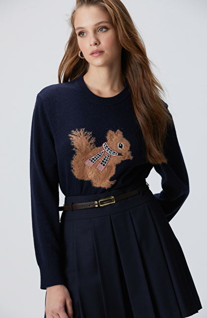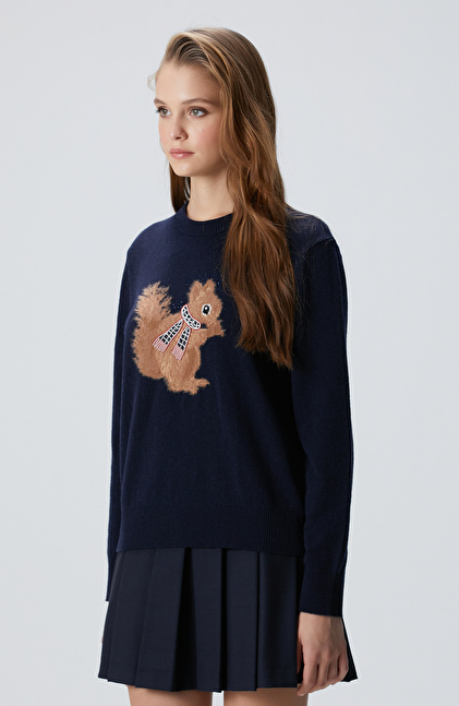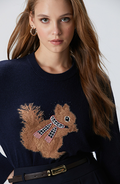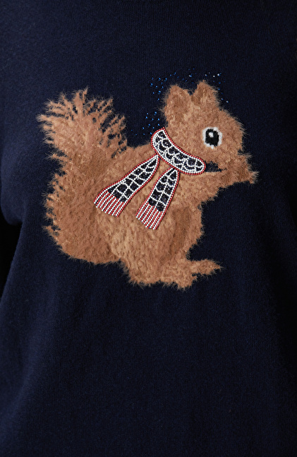 Regular Fit; Bisiklet Yaka; Uzun Kol; Triko Kazak; Yün Kaşmir Karışımlı; Sincap Figürlü