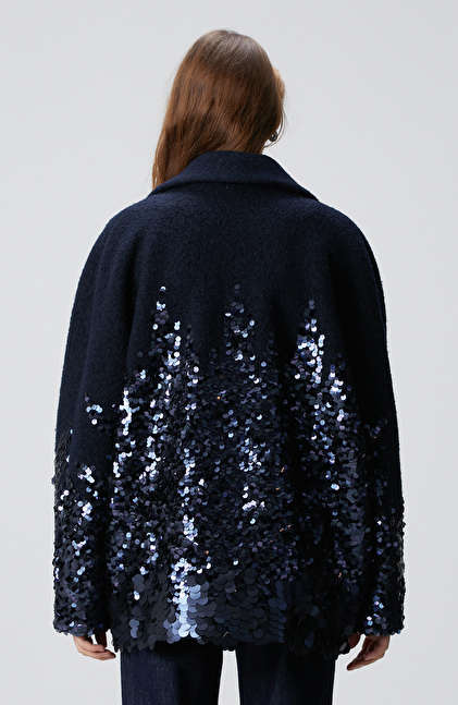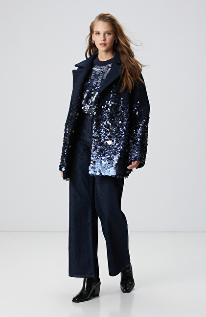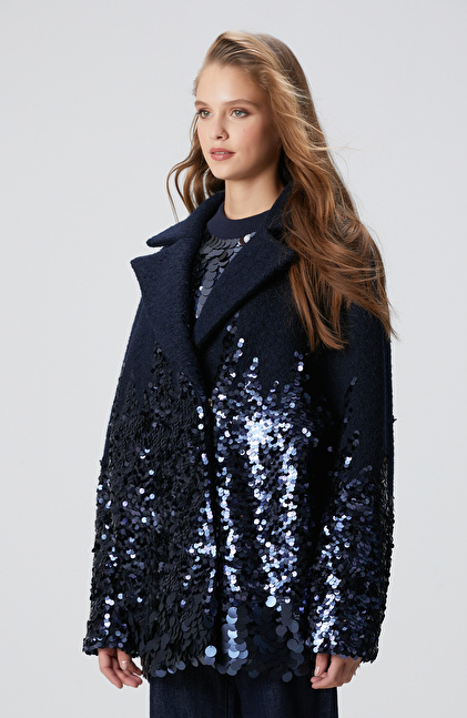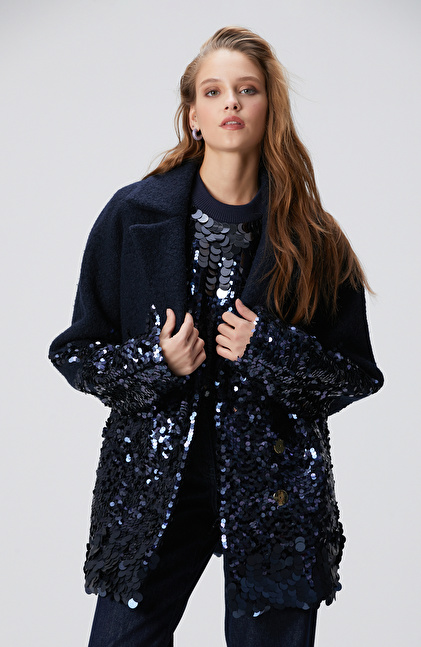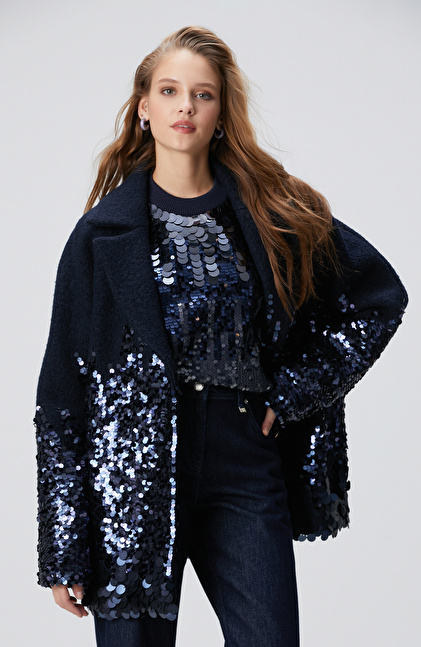 Lacivert Yün Karışımlı Payet Detaylı Kaban