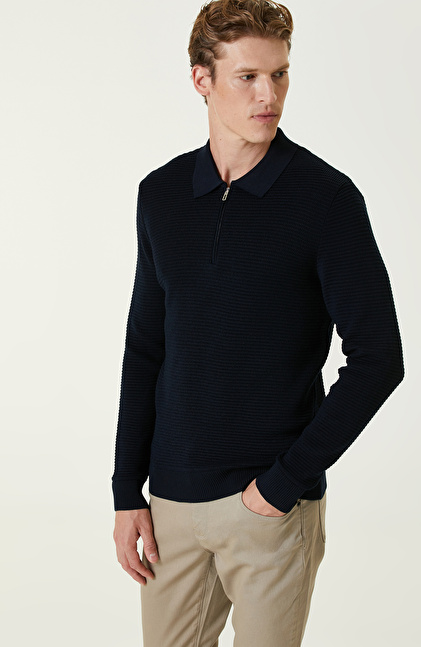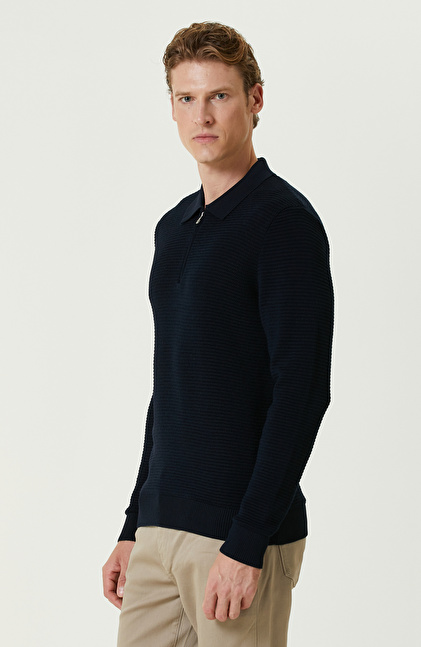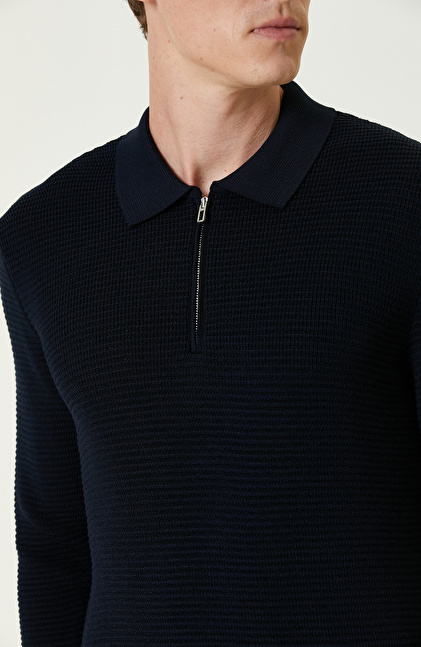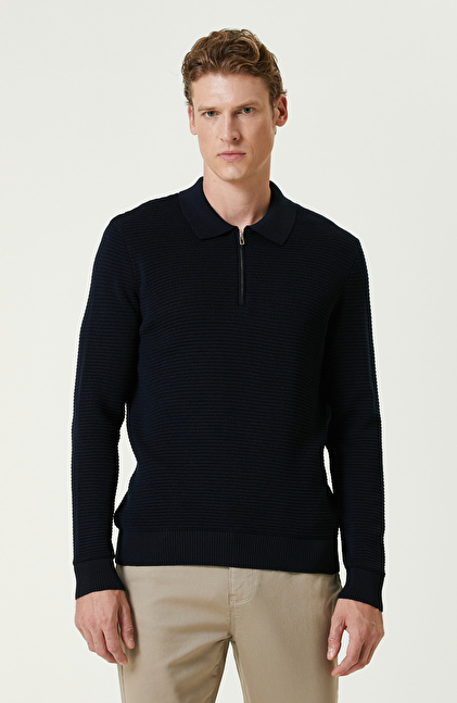 Lacivert Yün Karışımlı Polo Yaka Fermuarlı Triko Kazak