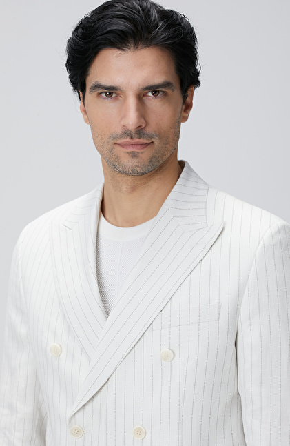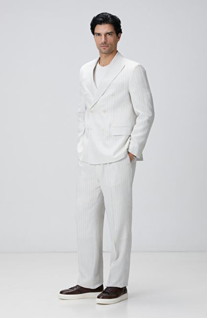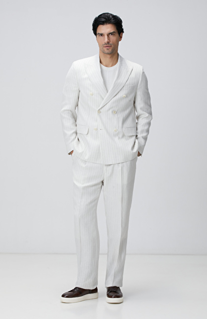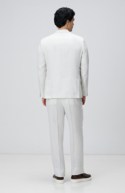 Kırık Beyaz Takım Elbise;Çizgili;Kruvaze Yaka;Slim Fit;Normal Bel;Düz Paça;Aplike Cep;Keten İpek Karışımlı;Loro Piana Kumaşından Üretilmiştir