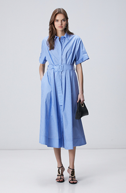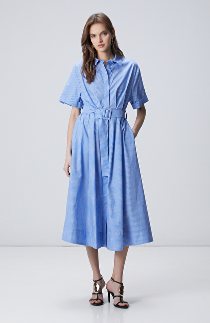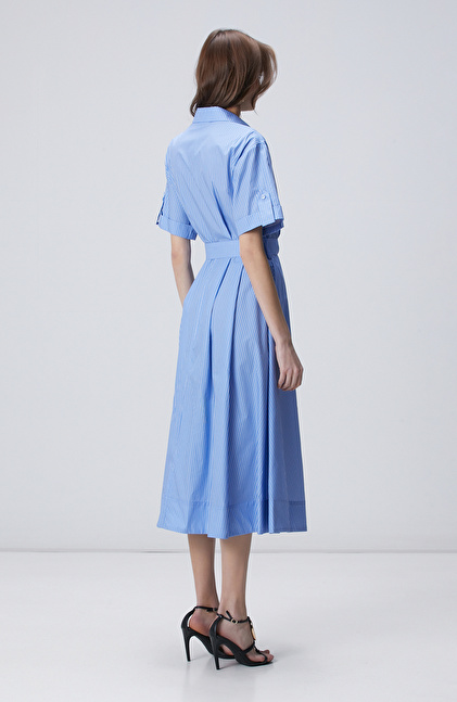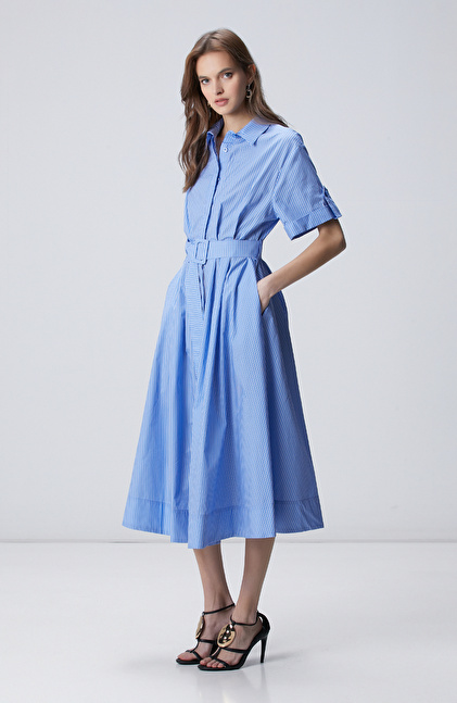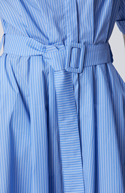 Mavi Beyaz Çizgili Desenli Midi Elbise
