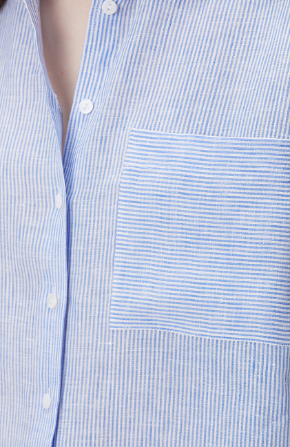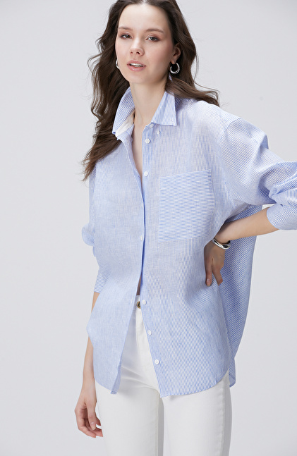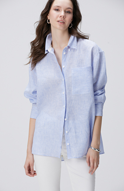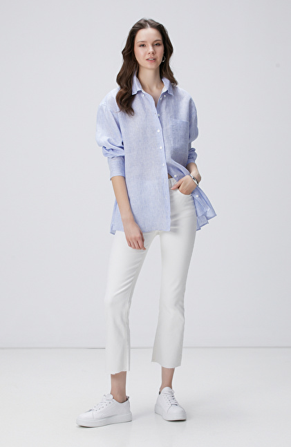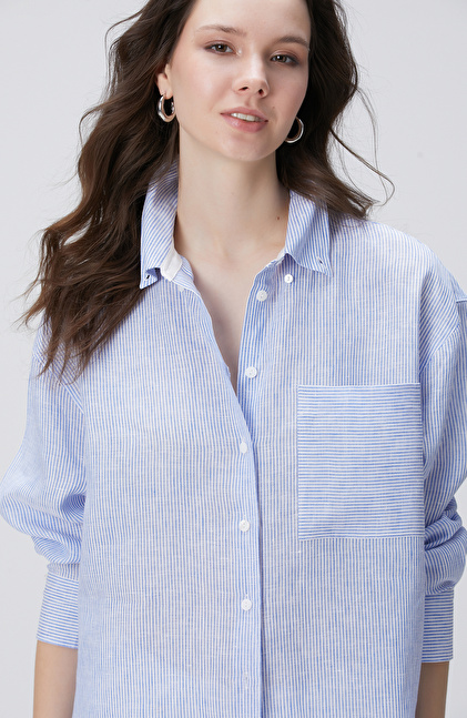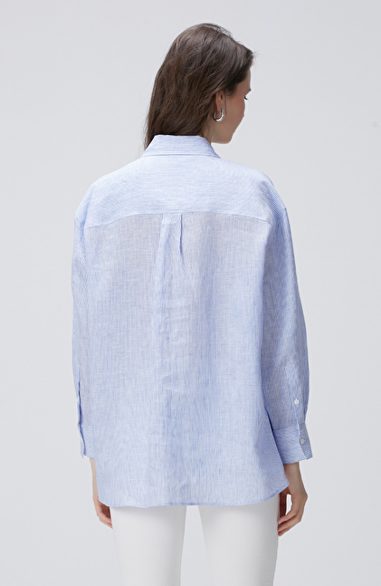 Mavi Beyaz Çizgili Keten Gömlek