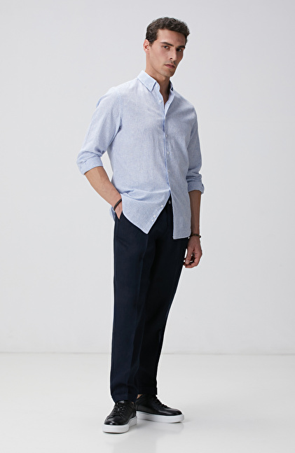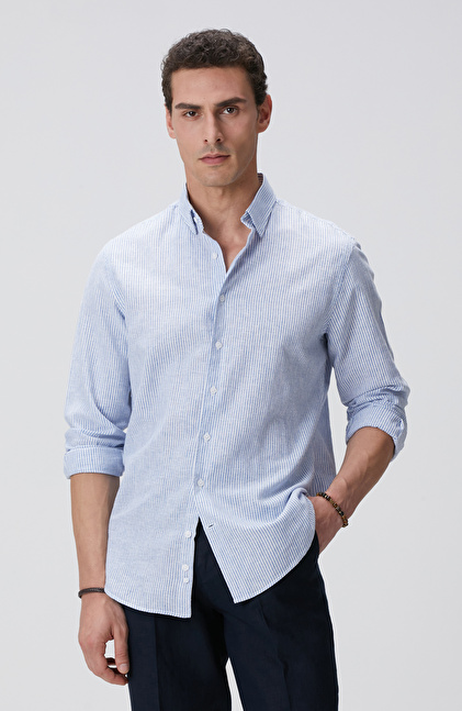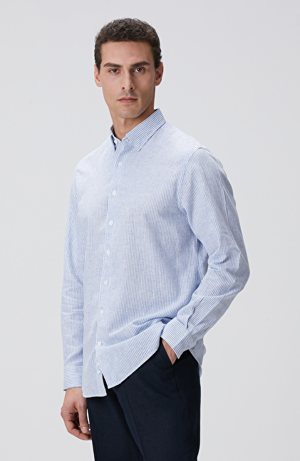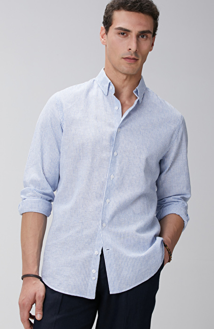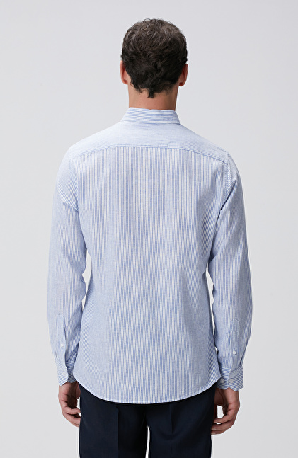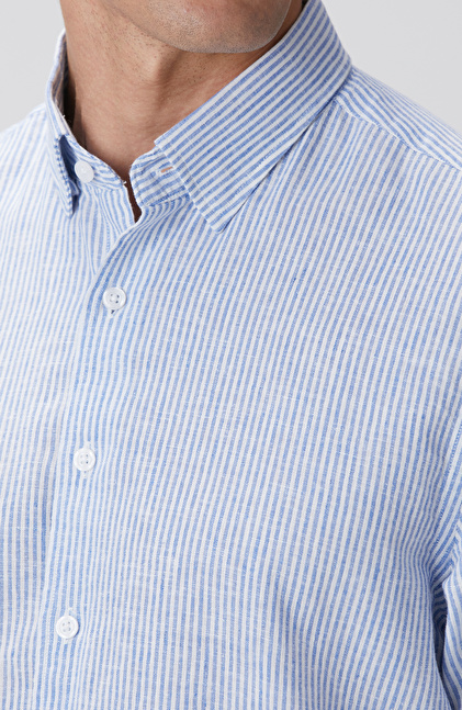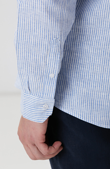 Mavi Beyaz Çizgili Keten Karışımlı Gömlek