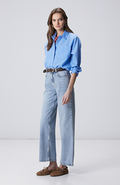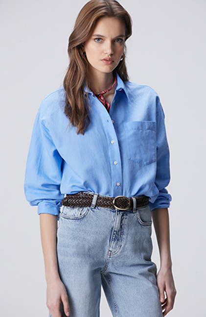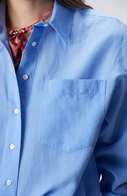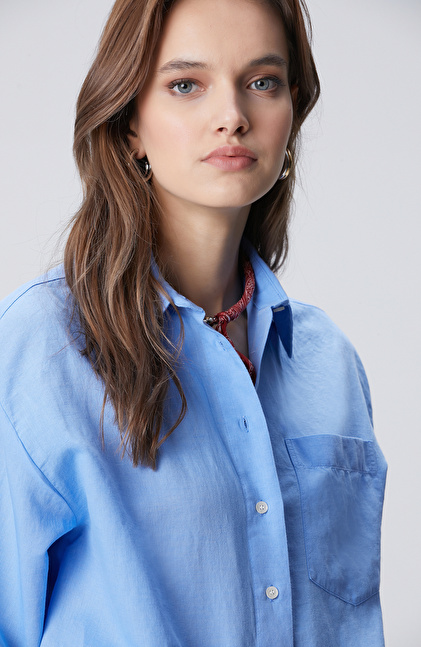 Mavi Cep Detaylı Basic Keten Karışımlı Gömlek