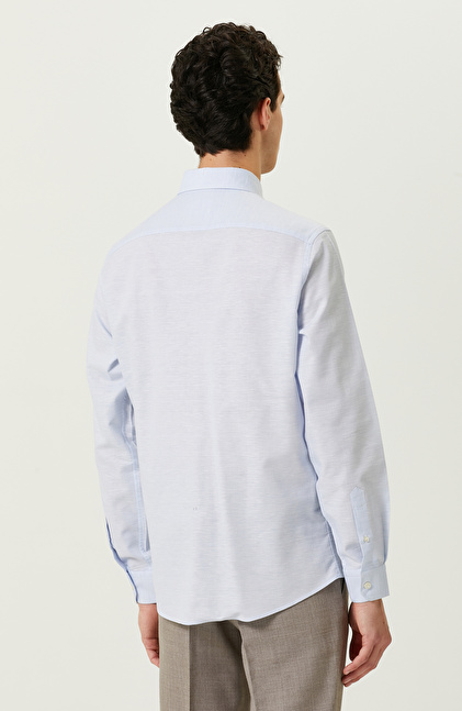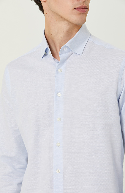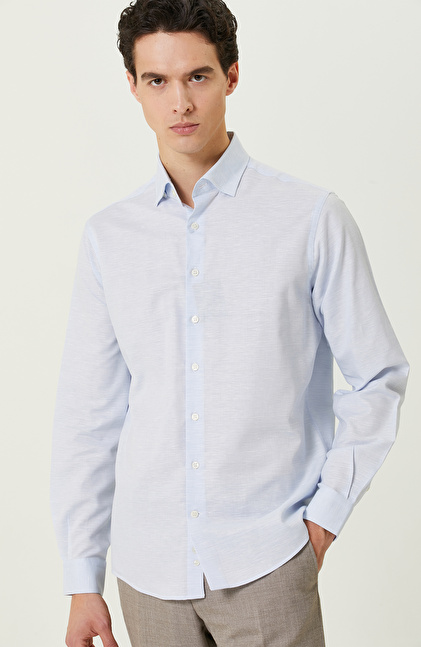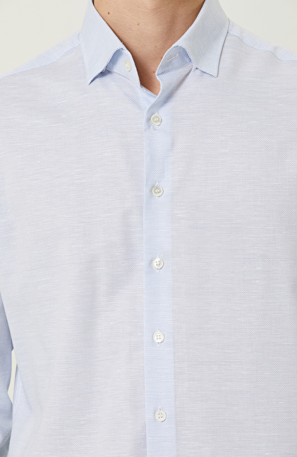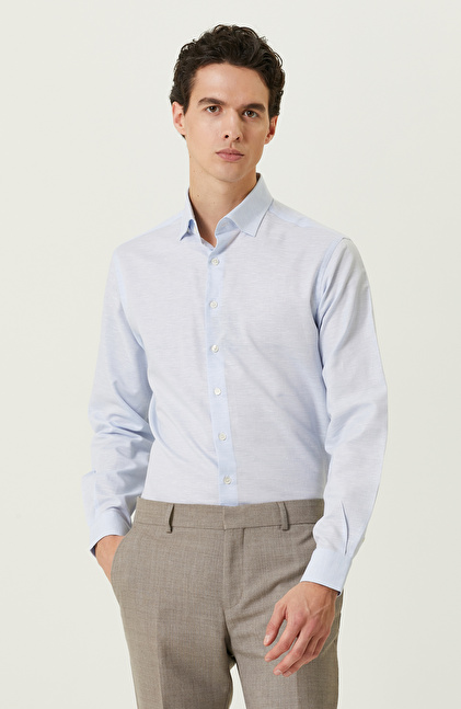 Metropolde yaşayan erkeğin modern çizgisini kusursuz olarak yansıtan Mavi Desenli Comfort Fit Gömlek, NetWork'ün Business serisinde yer alır. İlkbahar kullanımına uygun olan başarılı tasarım, açık mavi rengi sayesinde smart casual kombinlerde anahtar parça olarak kullanılabilir. Uzun kollu olması ve comfort fit kalıbı ofiste ve günlük yaşamda konforlu hissettirir. Alttan biritli yaka ise kravat kullanımını destekleyerek zamansız gömleğin resmi görüşmelerde de kullanılabilir olmasını sağlar. Siz de mavi renkli şık tasarımı lacivert keten casual pantolon ve lacivert sneaker ile eşleştirerek ilham verici bir görünüm oluşturabilir, kombininize bileklik ekleyerek cesur tarzınızı yansıtabilirsiniz.