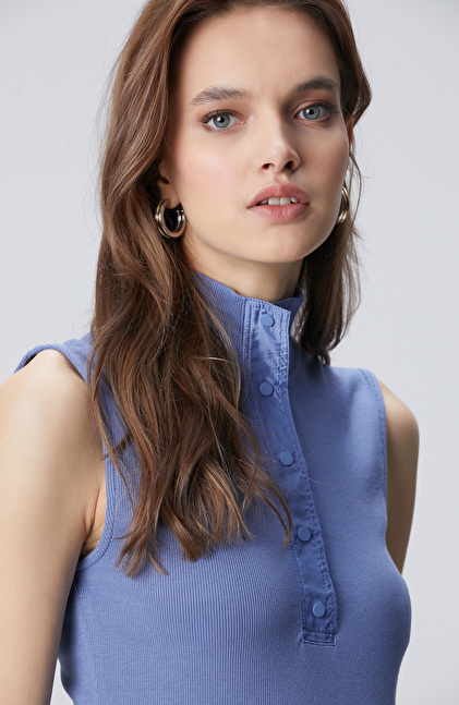 Slim Fit; Dik Yaka; Dokuma Garni Detaylı; Kolsuz; Modal Mix T-Shirt