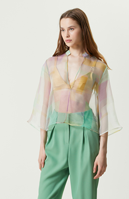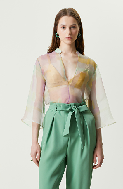 NetWork'ün Freshener serisinin yaz parçaları arasında yer alan Mint Truvakar Kol Dik Yaka Bluz, yeniliklere açık, stil sahibi kadınlara hitap eder. Özgün tasarımları kombinlerine uyarlamayı seven kadınların tercihi bluz, transparan formu sayesinde feminen görünümü destekler. Organze formu, dik yaka detayı sayesinde tüm kombinlerinize eşlik eder. V yaka tasarımı ile şık görünümler elde etmenizi sağlayan bluz, aynı zamanda truvakar kol kesimine sahiptir. Turuncu, mint ve pembe gibi renklerden oluşan deseni ise iddialı kombinler için son derece uygundur. Birçok renk içeren bluz farklı renkte büstiyerlerle rahatlıkla tamamlanabilir. Siz de regular fit bluzu, mavi büstiyer, mint şort, pembe sandalet ve rengarenk çantalarla kombinleyebilirsiniz.