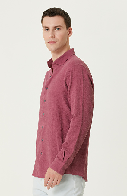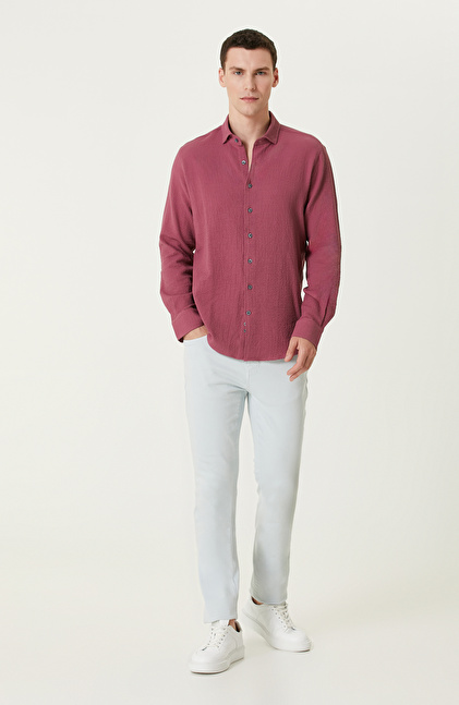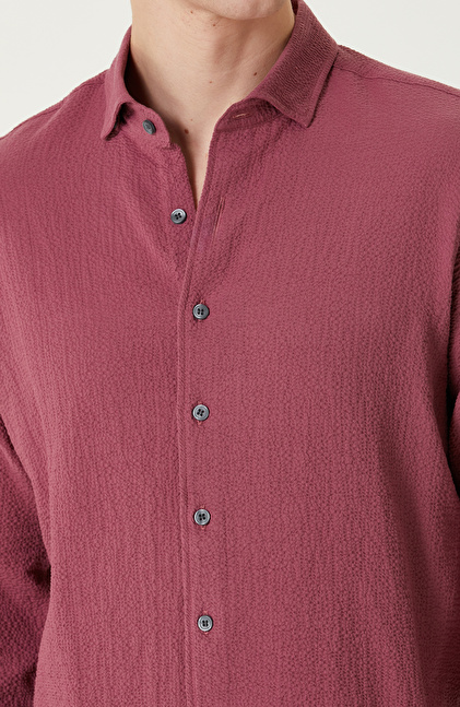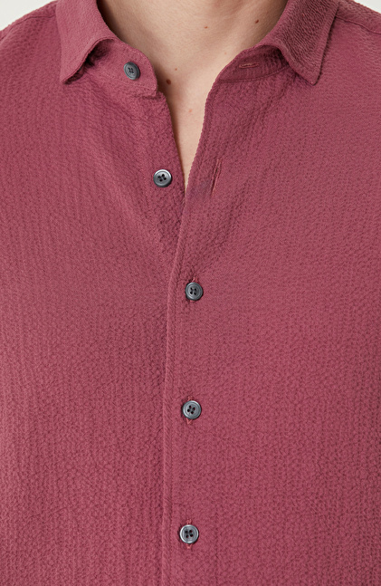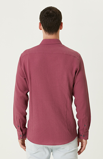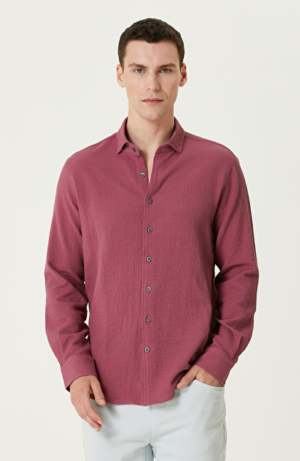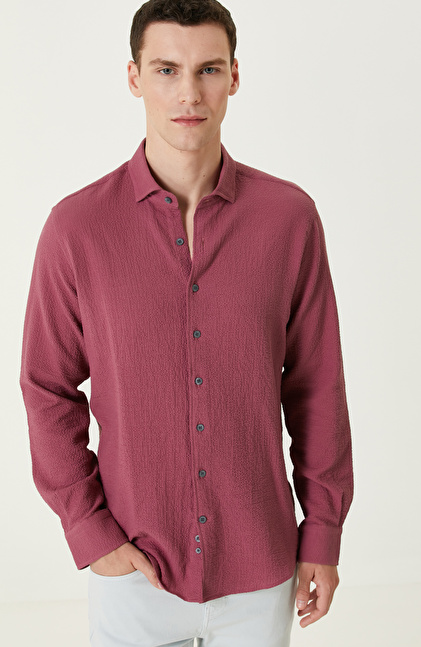NetWork'ün her zaman şık görünmeyi tercih eden erkeklere özel tasarladığı Cepsiz Alttan Britli Yaka Mürdüm Gömlek, kış koleksiyonunun Arche Minimal serisinde yer alır. Mükemmel pastel rengi sayesinde şehirli stilinizi destekleyen gömlek, cepsiz tasarımı sayesinde takım elbise ve casual giyim modelleriyle rahatlıkla giyilebilir. Dokuma ve gofreli kumaşı yüksek konfor sağlarken aynı zamanda yenilikçi kombinler elde etmenize olanak tanır. Alttan britli yaka detayı ise kravatlarınız ve ceketleriniz için zahmetsiz kullanım sunar. Siz de cepsiz ve fit görünüme sahip gömleği; antrasit ceket, indigo denim pantolon, kahverengi loafer ve deri aksesuarlarla kombinleyerek, şık stiller oluşturabilirsiniz.