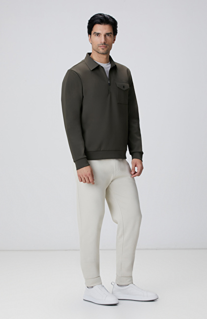 Slim Fit; Polo Yaka; Fermuarlı; Uzun Kol; Penye Sweatshirt; N-Tech; Düz Renk; Cepli