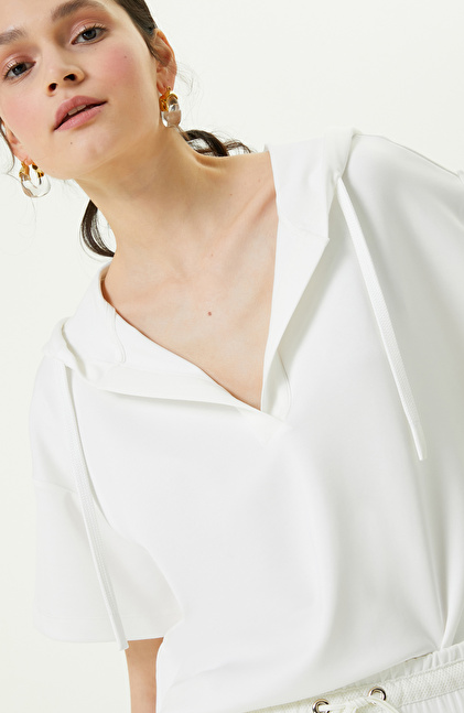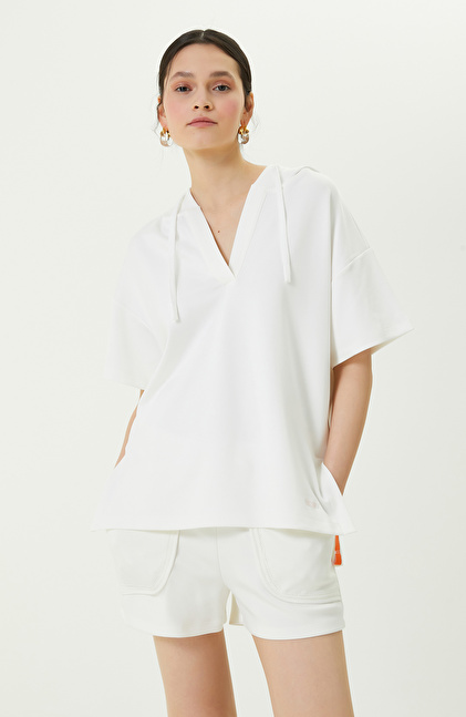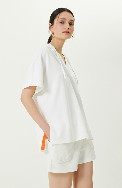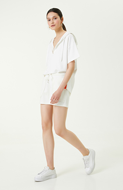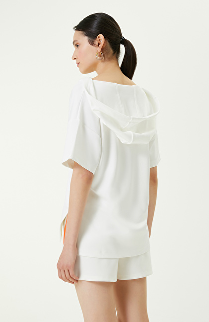NetWork yaz koleksiyonunun N-Tech serisinde yer alan Kırık Beyaz Kapüşonlu Sweatshirt, sosyal hayatta aktif ve dinamik kadınlara hitap eder. N-Tech kumaşı ile öne çıkan sweatshirt, yaz ayları için ideal parçalardan biridir. Geniş kolları ve basic fit kalıbı ile kumaşı destekleyen tasarım hem ferah görünüm hem de gün boyu konfor sağlar. Kapüşon yaka ile tamamlandığı için casualın yanı sıra sportif görünümleri de destekler. Yırtmaçlarında yer alan turuncu şeritler ise kırık beyaz sweatshirt'e hareketlilik kazandırır. Siz de kapüşonlu sweatshirt'ü; turuncu şort ile yaz kombinlerinize dahil edebilir, sarı sandalet, beyaz güneş gözlükleri ve akrilik takılarla mükemmel görünümler elde edebilirsiniz.