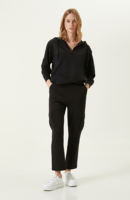 NetWork Casual koleksiyonunda yer alan N-Tech Siyah Pamuklu Kolda Fermuar Detaylı Sweatshirt, şıklığından ve konforundan ödün vermek istemeyen stil sahibi kadınlara hitap eder. N-Tech grubunun inovatif moda anlayışını her detayında yansıtır; yakasındaki fermuar ve ip ile oldukça işlevseldir. Kollarında da fermuar detayları yer alır. Gün içinde sportif bir kombin oluşturmak için kullanabilirsiniz. Pamuklu kumaşı ile hem sıcak hem de soğuk havalarda kullanım için uygundur ve hareket özgürlüğü sağlar. N-Tech logosu taşıyan sweatshirt, lüks ve elegan bir görünüme sahiptir. Siyah rengi ile siyah pantolon ve beyaz sneaker kombinlerine uyum gösterir.