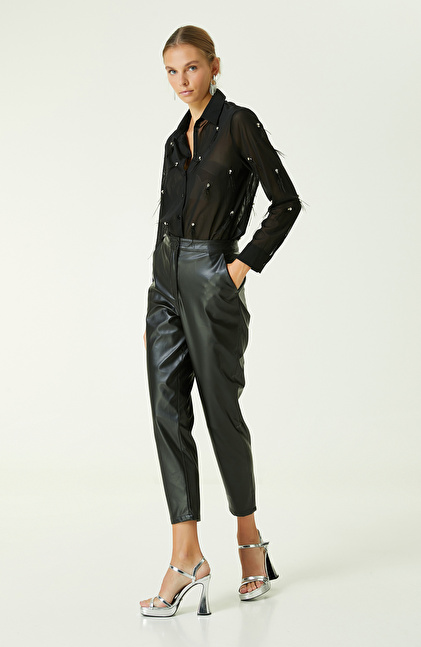 Elegan bir stil için anahtar parçalardan olan Otriş ve Taş Detaylı Siyah Gömlek, ikonik ve özgün tasarımı ile öne çıkar. NetWork Black koleksiyonda yer alan gömlek, iddialı ve şehirli stile sahip kadınlara hitap eder. Ofis ortamında ve özel günlerde kombinlerinize lüks bir dokunuş yapmak için tercih edebilirsiniz. Transparan gömlek üzerine bulunan otriş ve taş detaylar, tasarıma göz alıcı bir hava katar. Sonbahar/kış sezonunda kullanabileceğiniz parça, kaliteli dokusuyla da dikkat çeker. Ayrıca hareket özgürlüğü sunar, gün boyu rahatlık sağlar. Siyah gömlekle siyah deri pantolon, gümüş açık topuklu ayakkabı ve gümüş takı kombini yapabilirsiniz.
