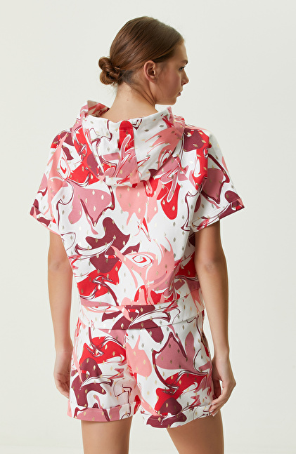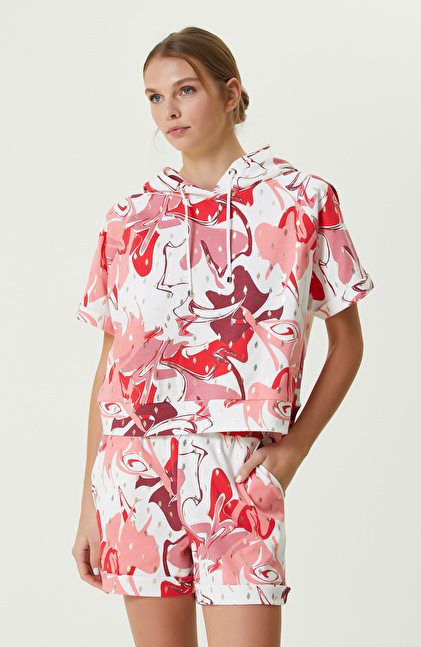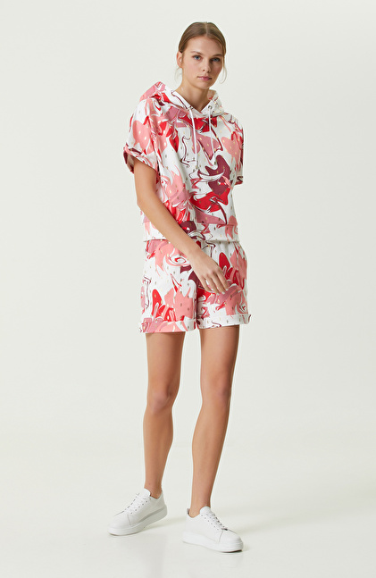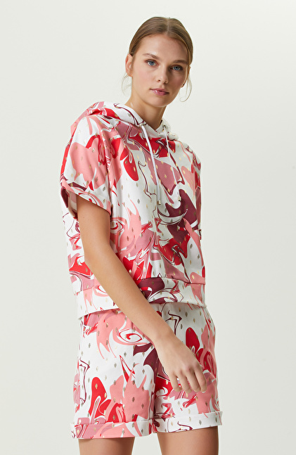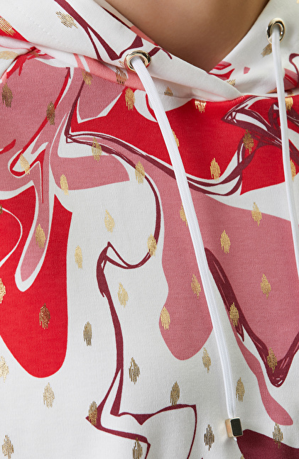 Pembe Beyaz Desenli Kapüşonlu Sweatshirt