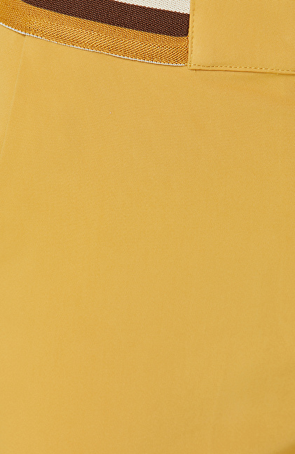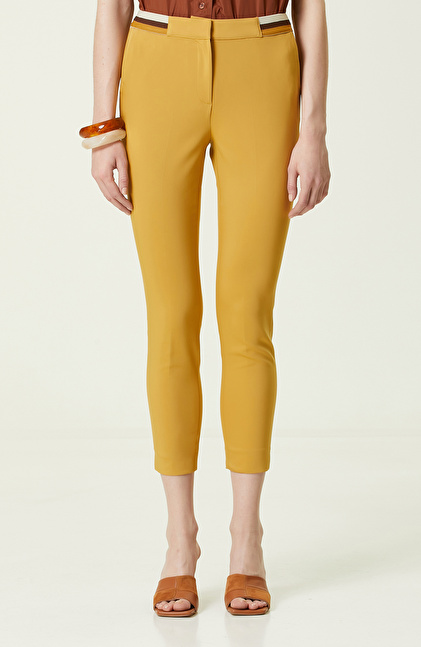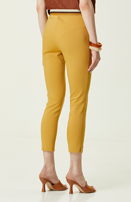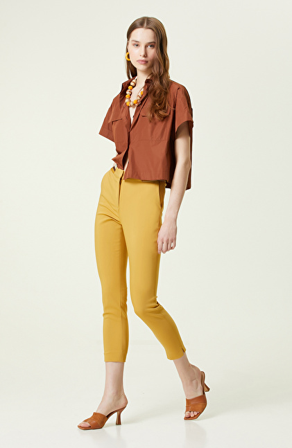 İddialı rengi ile Pigments serisinde yer alan Safran Beli Lastikli Dar Paça Pantolon NetWork'ün Business stilini yansıtır. İlkbahar/ yaz sezonunun lüks parçalardan biridir. Şık giyinmeye özen gösteren ve ofis kombinlerinde çarpıcı parçalara yer veren kadınlar için ideal tasarım özelliklerine sahiptir. Dar paça pantolonun lastik detaylı beli giyimi ve hareket etmeyi kolaylaştırır, belinizi mükemmel bir şekilde sarar. Yenilikçi tasarımı ile iş kombinlerine ilham verse de gündelik kombinler için de son derece uygundur. Siz de slim fit pantolonu, kısa kollu ekru gömlek, kahverengi makosen ve zincir detaylı kolyelerle eşleştirerek şık bir görünüm elde edebilirsiniz.
