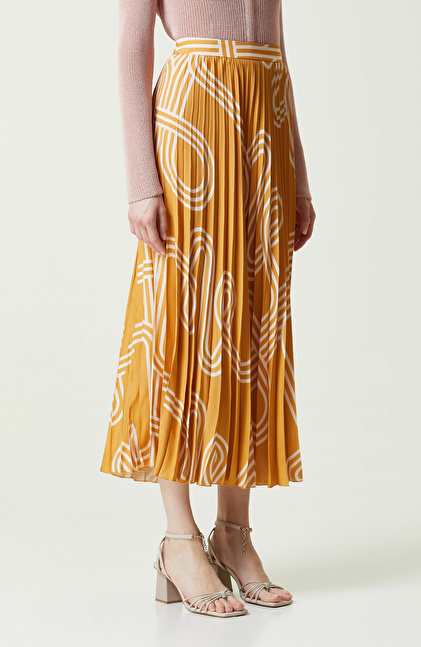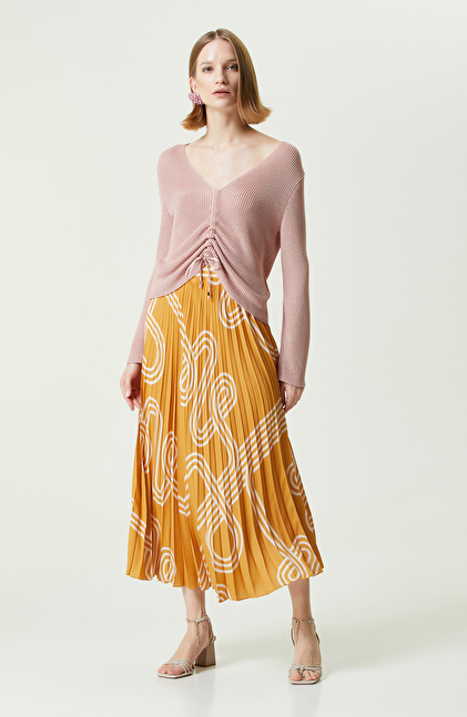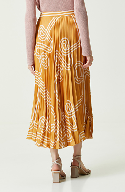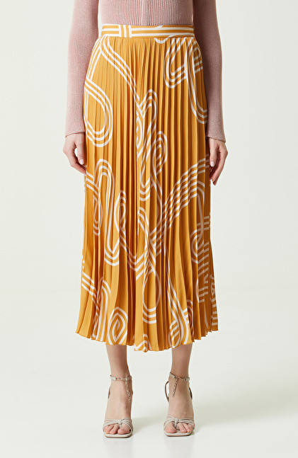 NetWork Smart Casual koleksiyonunun Contemporary Urban serisinde yer alan Safran Diz Boyu Dokuma Etek, pilenin zamansız stilini yansıtır. Yenilikçi çizgilerle oluşturulan desenler feminen bir görünüm sergiler. NetWork’ün lüks tarzını yansıtan modern tasarım, günlük kombinlere uyumlu rahatlığı ve şehirli kadının şıklığını bir arada sunar. Bileklerden biraz yukarıda sonlanan etek boyu ve yürürken esneyebilen pliseleri sayesinde hareket özgürlüğü kazandırır. Bahar ve yaz aylarının enerjisini yansıtan tasarım ile ekru ya da pudra renkli ince bir triko kazak giyebilir, kombininizi bej tonlarda stiletto ya da sandalet ile tamamlayabilirsiniz. Kombininize parlak taşlı ve çiçek desenli iddialı küpeler ekleyerek kusursuz bir görünüme kavuşabilirsiniz.