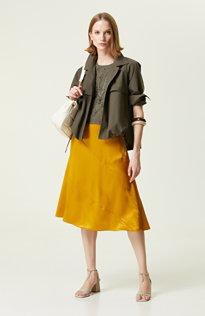 Modern çizgisinden çıkmayan NetWork’ün lüks moda anlayışının bir ürünü olan Safran Midi Boy Etek,sofistike kadının kullanımına uygun yapıda tasarlanır. Yumuşacık ve hafif dokuma kumaşı kullanılarak elde edilen kesik detaylı evaze saten etek, smart casual stilini yansıtmayı başaran parçalar arasındadır. Birbirinden iddialı tasarımları barındıran Pigments koleksiyonunun normal bel detaylı modeli, regular fit kalıbı sayesinde rahatlıkla giyilir. Mid boy formlu etek, şık giyinmeyi seven kadınlara hitap eder. Eteği iddialı bir biçimde kombinlerken; haki t-shirt ve ceket, bilezik, ince bantlı krem rengi ayakkabı, altın renk tonlarında takılar ve altın detaylı omuz çantası kullanabilirsiniz.