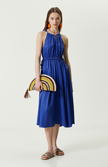 Stil sahibi kadınların giyimi için tasarımlarını sürdüren NetWork’ün lüks ve yaratıcı modelleri arasında bulunan Saks Mavisi Askılı Triko Elbise, ilkbahar/yaz sezonu için değerlendirilir. Askılı yapısıyla kullanışlı bir deneyim oluşturan elbise, slim fit kalıplı olarak hazırlanır. Mid boy formu ile yaz sıcaklarında konforlu şekilde giyilir. Beli büzgülü detayı ile şık ve iddialı bir parçadır. Smart casual stilini yansıtan model, kolsuzdur. Viskoz karışımlı kumaştan elde edilen tasarım, yumuşacık dokuma hissiyatına sahiptir. Kolsuz belde büzgü detaylı uzun elbiseyi ilham verici biçimde kombinlemek için; düz taban sandalet, örgü çanta ve altın detaylı takılar kullanabilirsiniz.