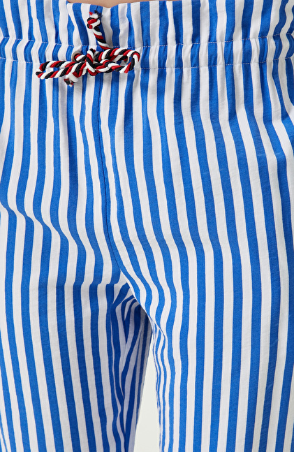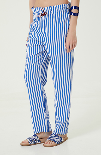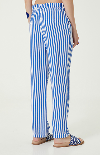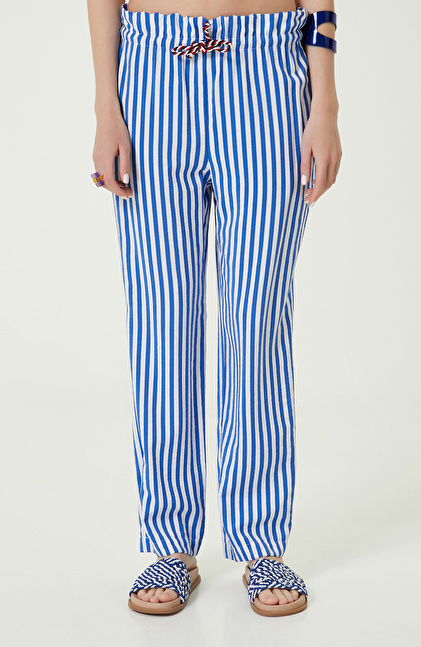 Saks Mavisi Beyaz Çizgili Yüksek Bel Pantolon