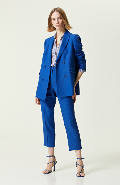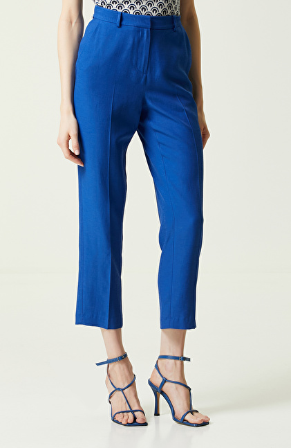 Çağdaş NetWork tarzını yansıtan Saks Mavisi Normal Bel Dar Paça Pantolon, yaz mevsimi için kadınlara uygun bir tercihtir. Dokuma kumaş hissiyatına sahip viskoz karışımlı düz kesim pantolon, ferahlık yaratan yapısıyla rahat bir kullanım sağlar. Line + Tone serisinin bir üyesi olan business stilini vurgulayan parça slim fit kesimlidir. Normal bel ve dar paça detayları ile dizaynı oluşturulan düz saks mavisi dokuma pantolon ofis ortamında giyilmeye uygundur. Beden uygunluğunu kontrol etmek için NetWork beden tablosunu inceleyebilirsiniz. Bu zamansız tasarımı takım şeklinde saks mavisi oversize blazer ceket, farklı renklerde gömlekler ve gümüş küpeler ile kombinleyebilirsiniz.