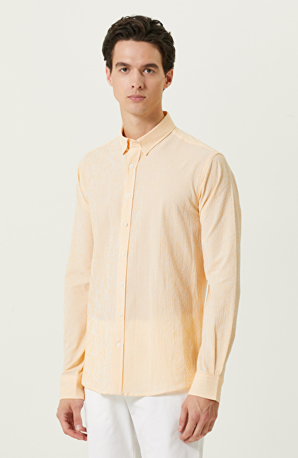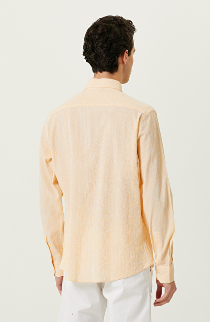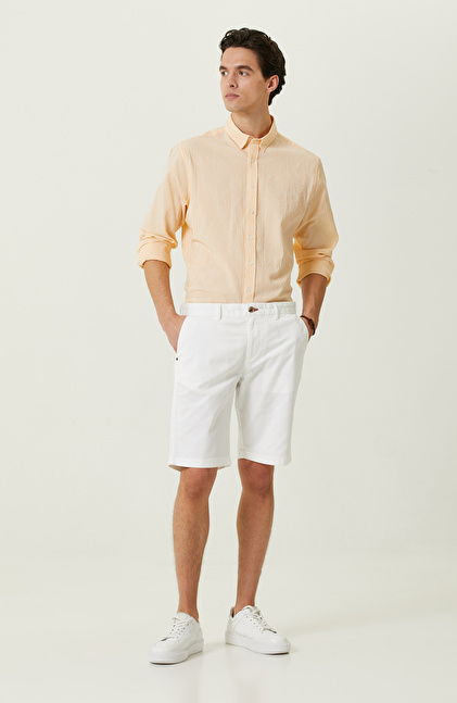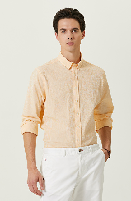 NetWork Casual çizgisinde bulunan sarı beyaz çizgili gömlek, şehirli erkeklerin görünümü şık detaylarla bir araya getirir. Yüksek kaliteli kumaşı ve alttan britli yakası sayesinde fonksiyonel bir yapıya sahiptir. Non Iron teknolojisi sayesinde ütüye gereksinim duymaz. Yıkandıktan sonra formunu koruduğu için oldukça kullanışlıdır. Yüksek duruşuyla metropolde yaşayan erkeklerin stilini yansıtır. Dokuma kumaşı ve hafifliği sayesinde sıcak yaz dönemlerinde dinamik erkeklerin kombinlerinin eşsiz bir parçası olur. Gömleği beyaz şort ve sneaker ile kombinleyebilir, kahverengi tonlarında bir bileklikle lüks bir bitiş elde edebilirsiniz.