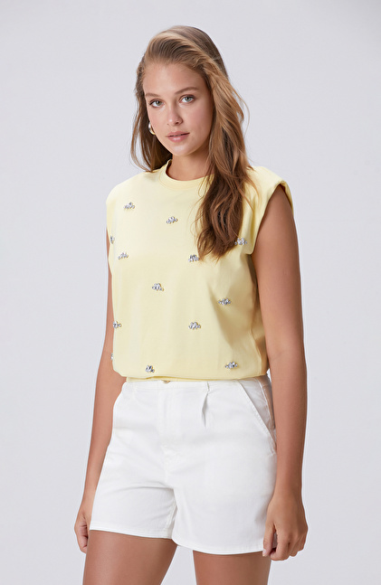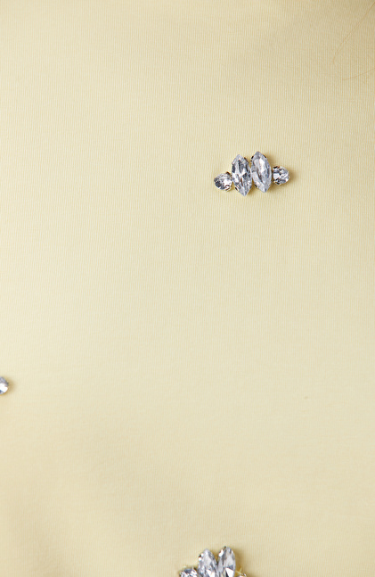 Sarı Bisiklet Yaka İri Taş Baskı Detaylı T-shirt