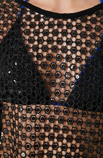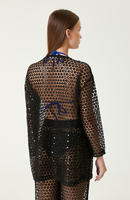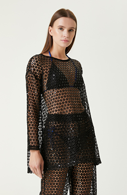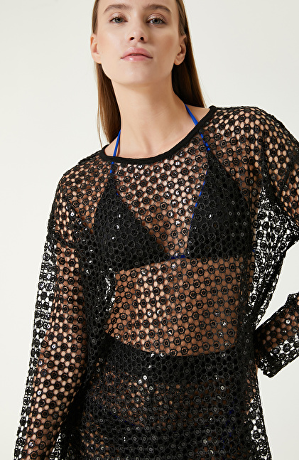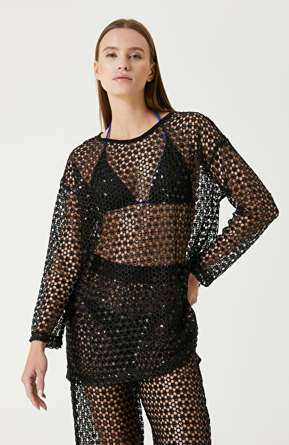 Regular Fit; Bisiklet Yaka; Uzun Kol; Tunik Formlu Plaj Bluz; Ajurlu; Payetli