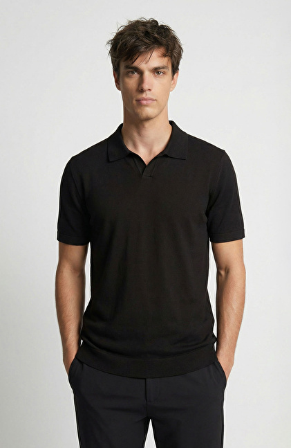 NETWORK Siyah Apaş Yaka Basic Kısa Kol Kazak