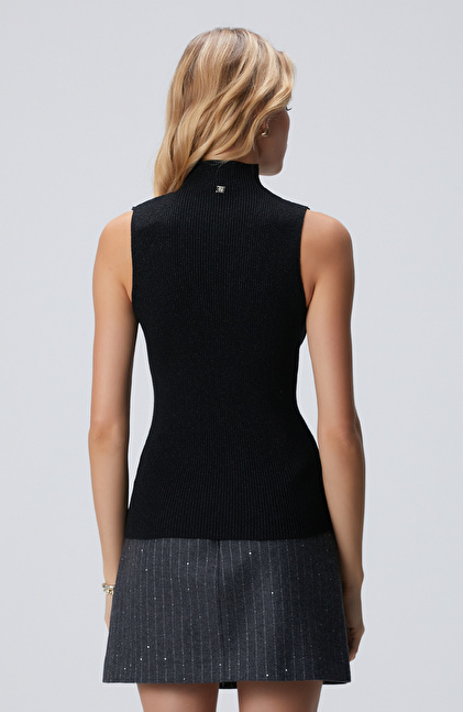 Siyah Balıkçı Yaka Kolsuz Simli Triko Kazak