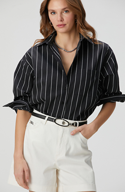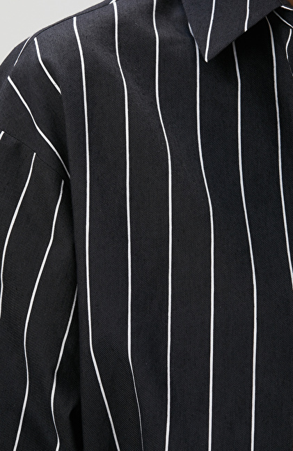 Siyah Beyaz Çizgili Keten Karışımlı Gömlek