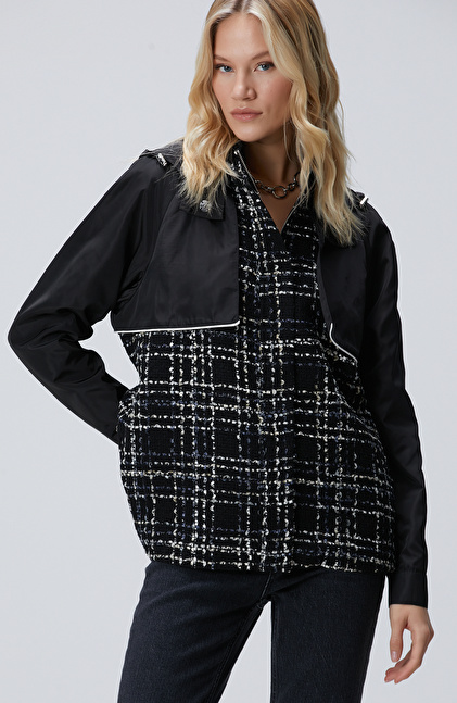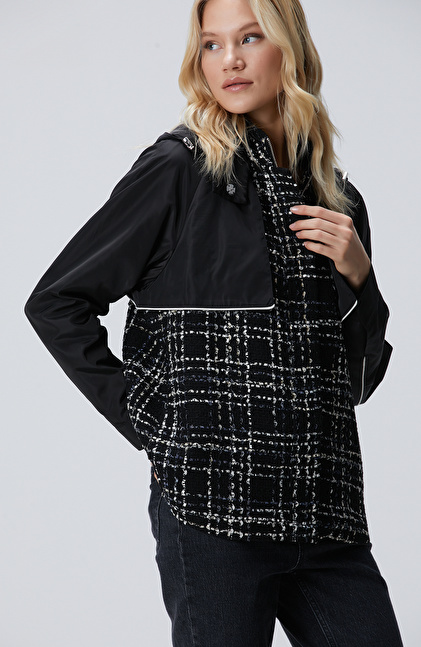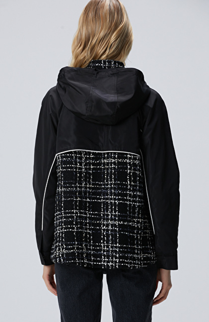 Regular Fit; Kapüşon Yaka; Ekose Desenli; Micro Tweed Mont;