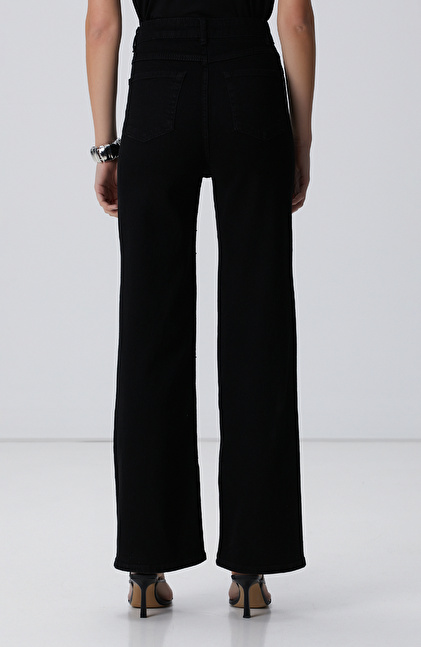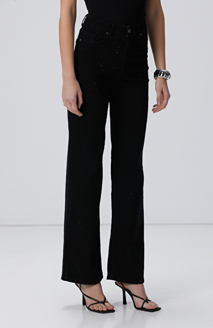 Basic Fit; Normal Bel; Bol Paça (Wide Leg) Denim Pantolon; Taş Baskılı; 5 Cepli