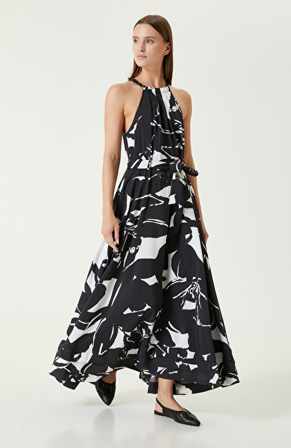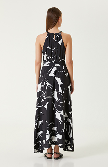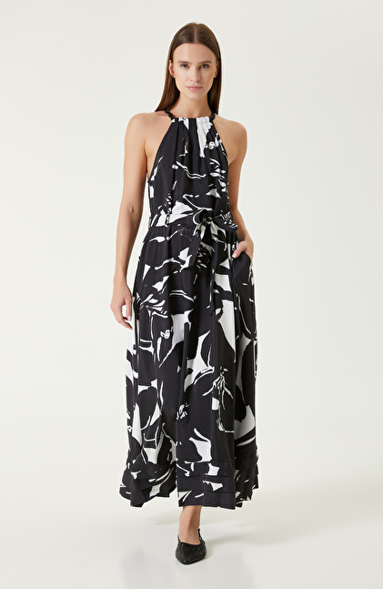 Regular Fit; Bisiklet Yaka; Kolsuz; Maksi Boy Elbise; Desenli; Yakada Dikiş Detaylı; Beli Kemerli