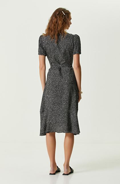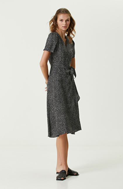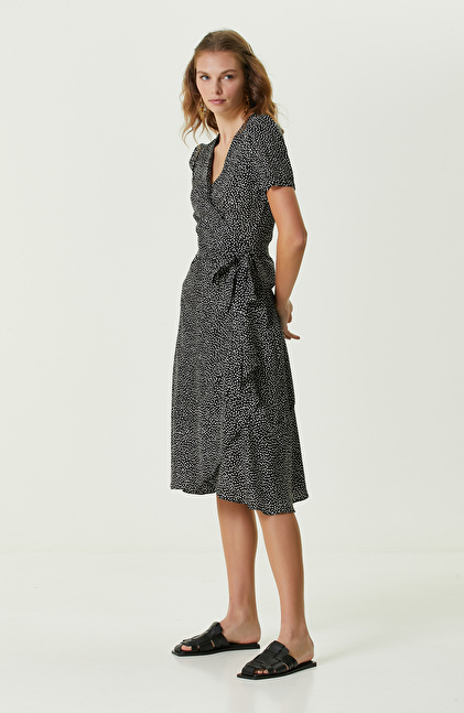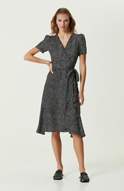 Siyah Desenli Kruvaze Yaka Diz Boy Elbise
