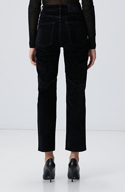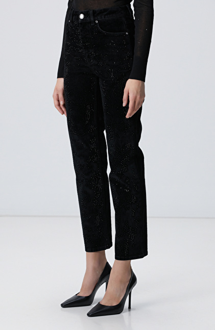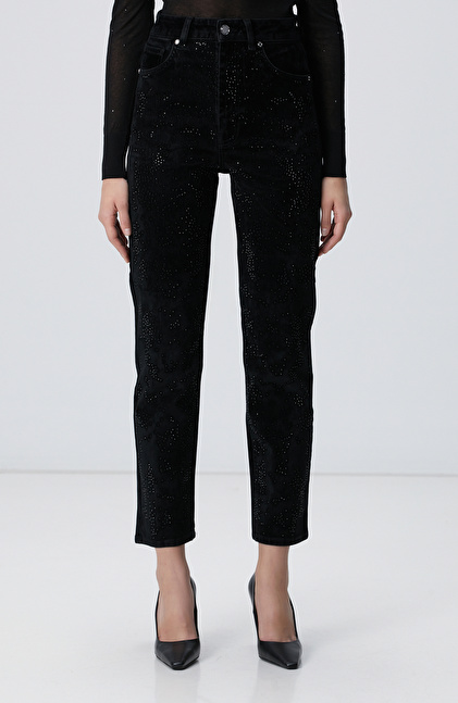 Straight Fit; Yüksek Bel; Taş Baskılı; Kadife Denim Pantolon; Düz Paça; Cepli