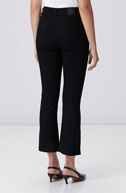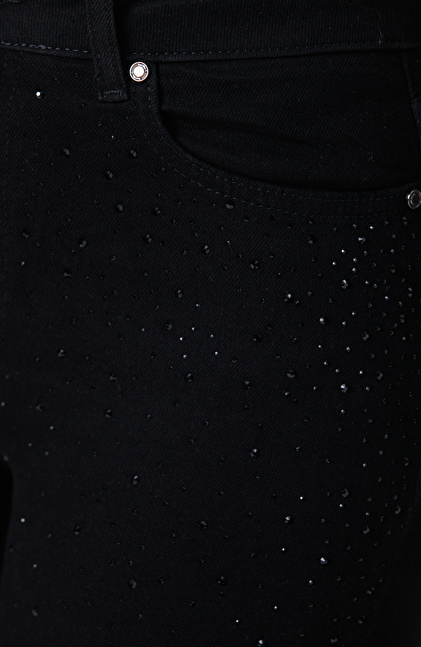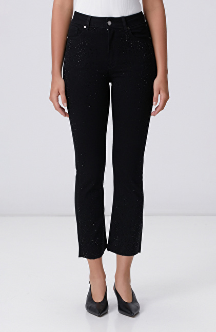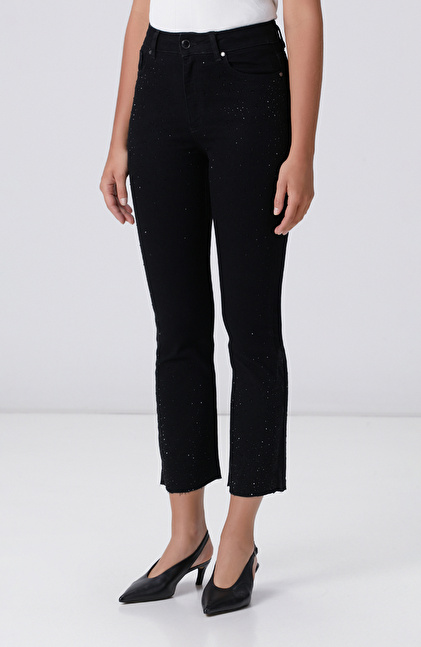 Siyah Kesik Paça Detaylı Taş Baskı Denim Pantolon