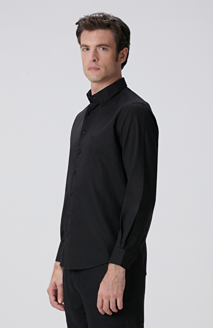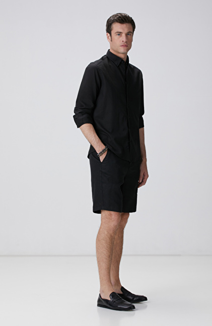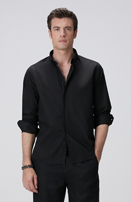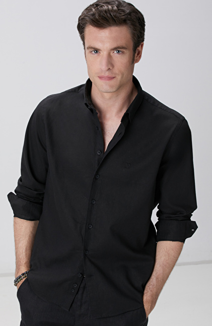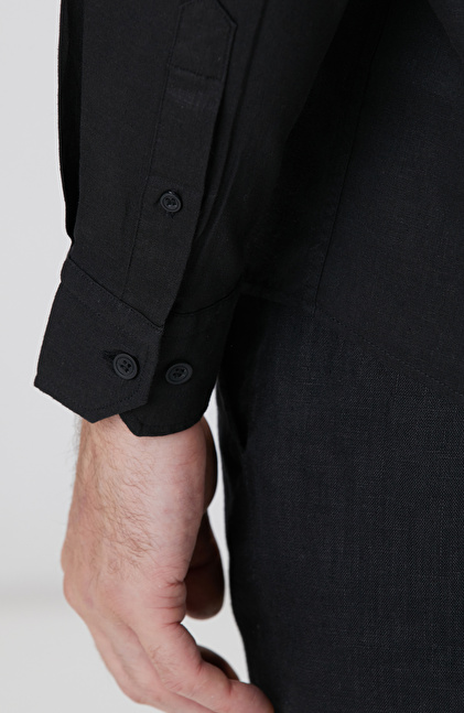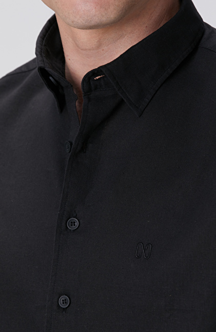 Siyah Keten Karışımlı Gömlek