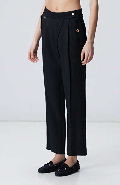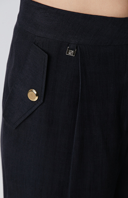 Siyah Keten Karışımlı Kapaklı Cepli Pantolon
