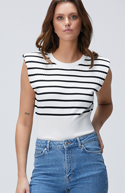 Siyah Kırık Beyaz Düşük Kol Çizgili Triko