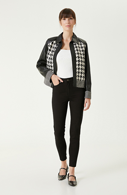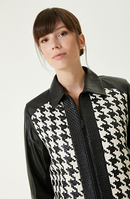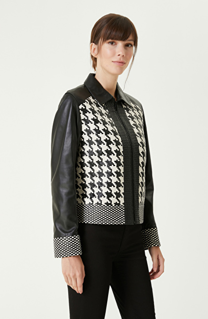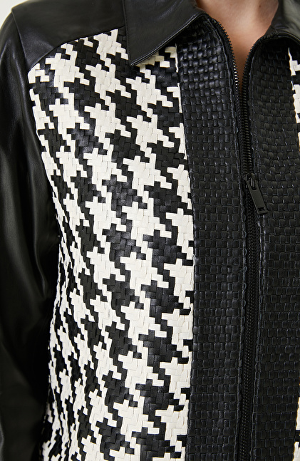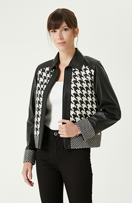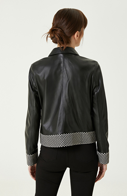 Siyah Kırık Beyaz Örgü Detaylı Deri Mont