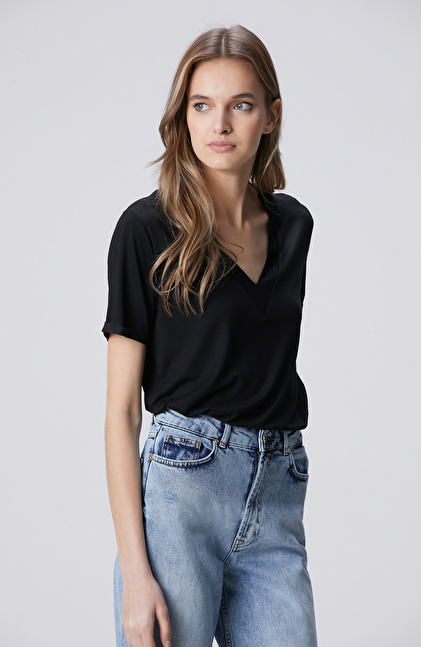 Siyah Kol Katlama Detaylı Basic T-shirt