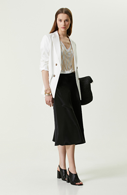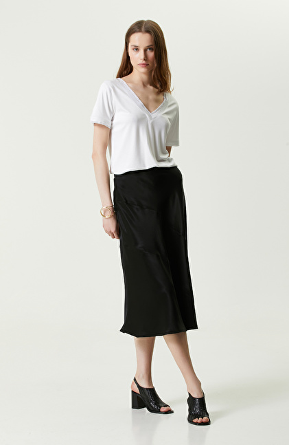 NetWork Smart Casual koleksiyonları arasında yer alan Siyah Midi Boy Saten Etek, her zaman şık giyinmeye özen gösteren, özgüveni yüksek kadınlara hitap eder. Yarı parlak formu sayesinde dikkat çekici bir görünüm oluşturan etek, ceket kombinleri için idealdir. Saten ve yumuşak yapısı ile öne çıkan etek aynı zamanda midi boyu sayesinde hemen her ayakkabı modeli ile uyum sağlar. Önde ve arkada dikişle desteklenen kesik detayları bulunur. Eteğin daha hareketli görünmesini sağlayan dikişler, evaze kesim ile öne çıkar. Siz de bu şık eteği mavi saten bluz, turkuaz sandalet ve altın renkli takılarla kombinleyebilirsiniz.